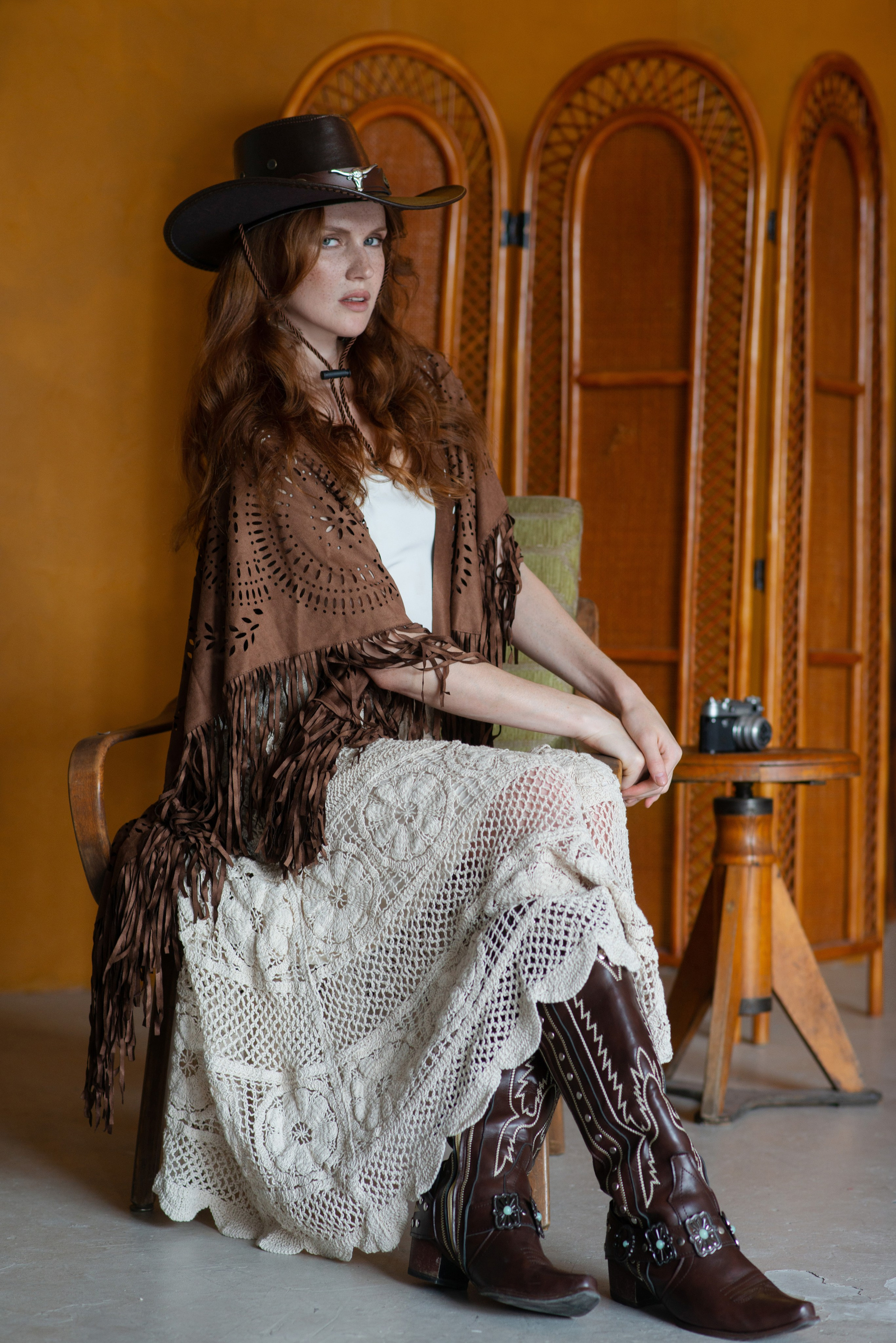 Образ в стиле бохо - шляпа, пончо, юбка, сапоги. Прокат 8000 руб, залог 15000 руб.