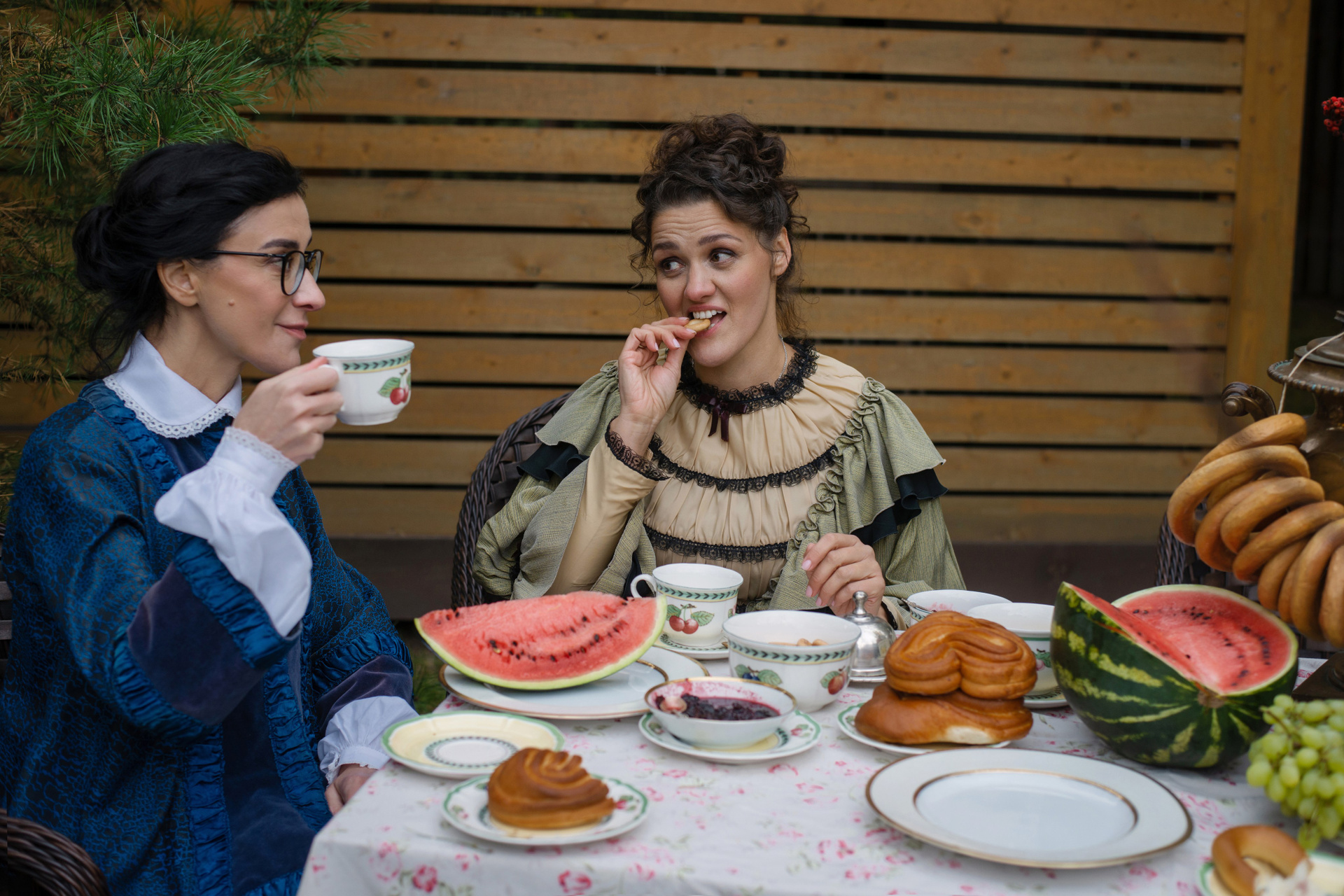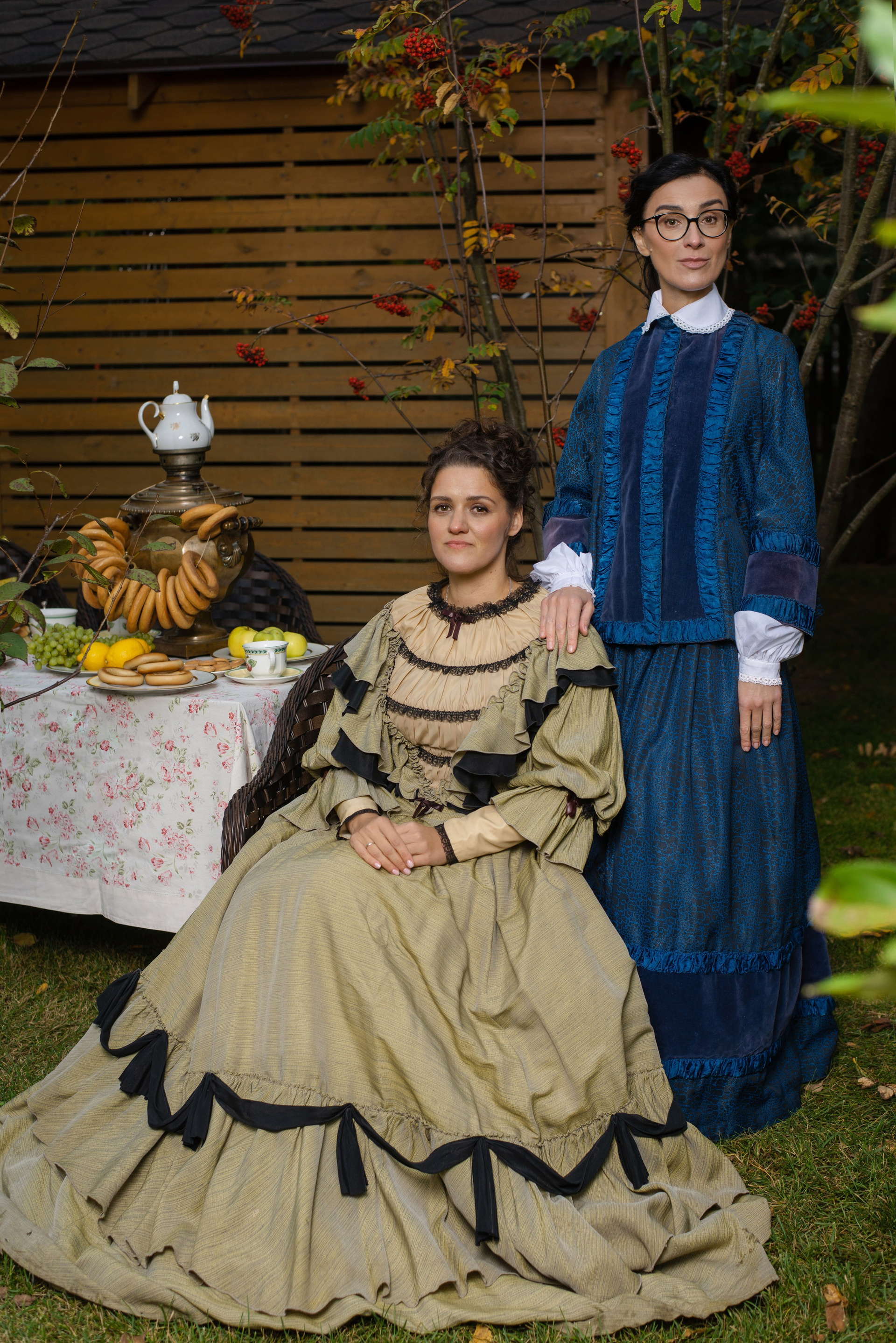 Нужны будут костюмы, соответствующие выбранной эпохе — определенному десятилетию XIX века или началу XX века. Тут могут быть платья с кринолинами, либо турнюрами, шляпки и платки, мундиры, цилиндры, фраки, либо льняные рубашки, жилеты, картузы.